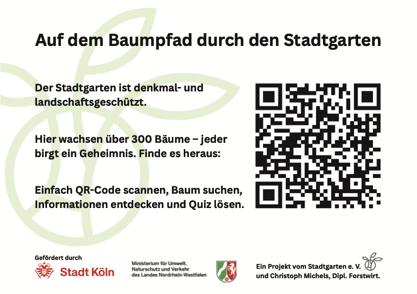 Dipl. Forstwirt Christoph Michels von der Deutschen Dendrologischen Gesellschaft hat für unseren Verein die Bäume im Stadtgarten exakt bestimmt und und mit Geodaten versehen. Jetzt kann jede und jeder sie über einen QR-Code mit dem Handy abrufen und dort Informationen über die jeweilige Baumart finden. – Das ist eine echte Innovation und gibt es sonst für keine andere Kölner Grünanlage.