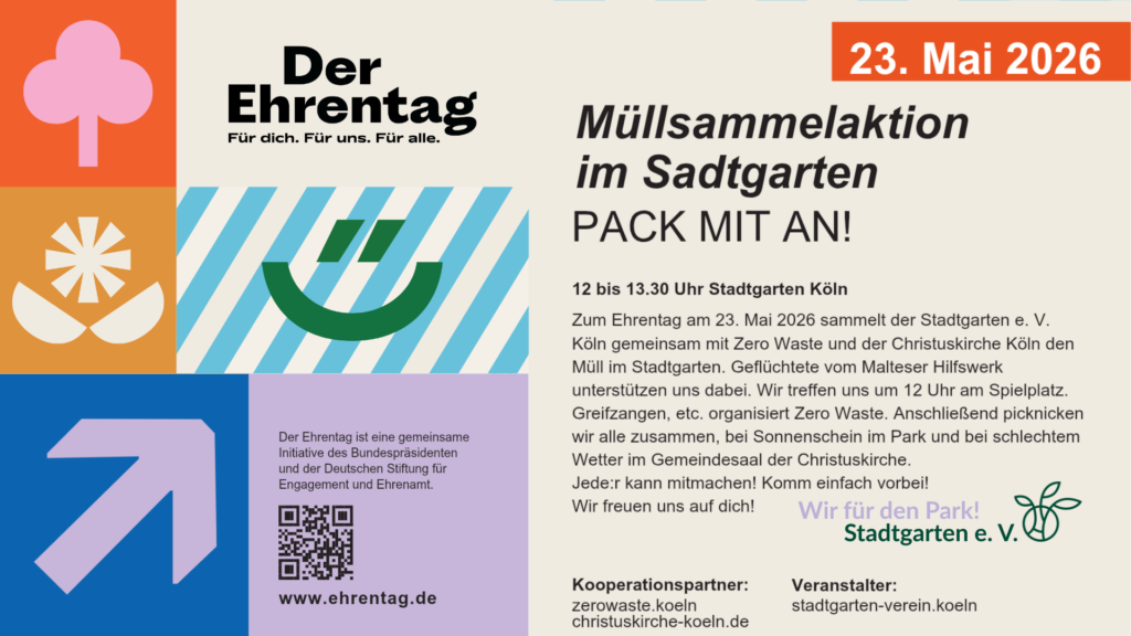 Was für eine spannende Zeit liegt hinter uns! – 2025 war ein intensives Jahr voller gemeinschaftlicher Aktivitäten – das wäre ohne Eure großzügige Unterstützung nicht möglich gewesen. Dank Eurer vertrauensvollen Zusammenarbeit, klugen Beratung und dem unermüdlichen Einsatz aller Ehrenamtlichen und Aktivist:innen konnten wir gemeinsam unsere Aktionen und Diskurse rund um den Park und das Stadtgarten Superveedel so nachhaltig umsetzen. – Ihr macht den Stadtgarten e. V. zu dem, was er ist!